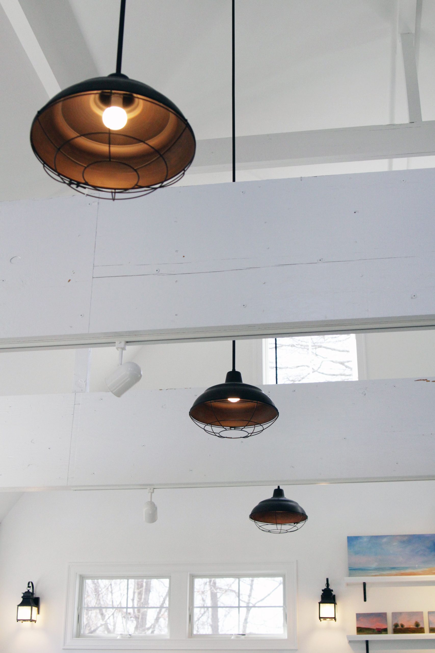 A: We had lots of windows placed as high as possible on the barn walls to leave large amounts of open wall space for hanging pictures. The windows also allowed natural lighting to flood into the barn during the day. But painting at nighttime required tons of lighting! The walls are wrapped in outdoor lanterns that are being used as sconces. There are eight pendant lights hanging from the ceilings for additional lighting. We also have track lights stealthily placed on beams that blend in color; this lighting is used to spotlight pictures.